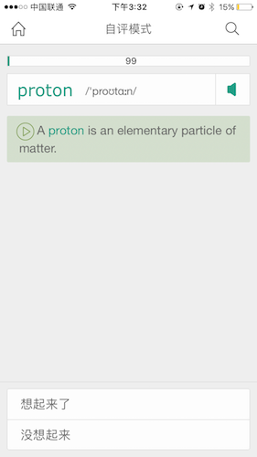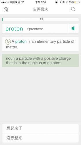 在图中底部出现选项“想起来了”和“没想起来”。点击“想起来了”跳转到单词的详情页图5,点击“没想起来”,保留在本页面,但页面显示的内容增加了单词的英文解释